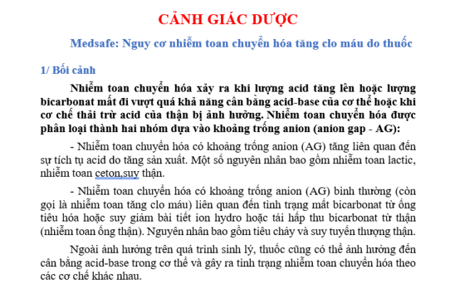 [CẢNH GIÁC DƯỢC] MEDSAFE: NGUY CƠ NHIỄM TOAN CHUYỂN HÓA TĂNG CLO MÁU DO THUỐC