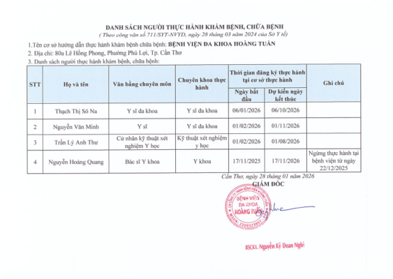 DANH SÁCH NGƯỜI THỰC HÀNH KHÁM, CHỮA BỆNH TẠI BỆNH VIỆN ĐA KHOA HOÀNG TUẤN THÁNG 6 NĂM 2025