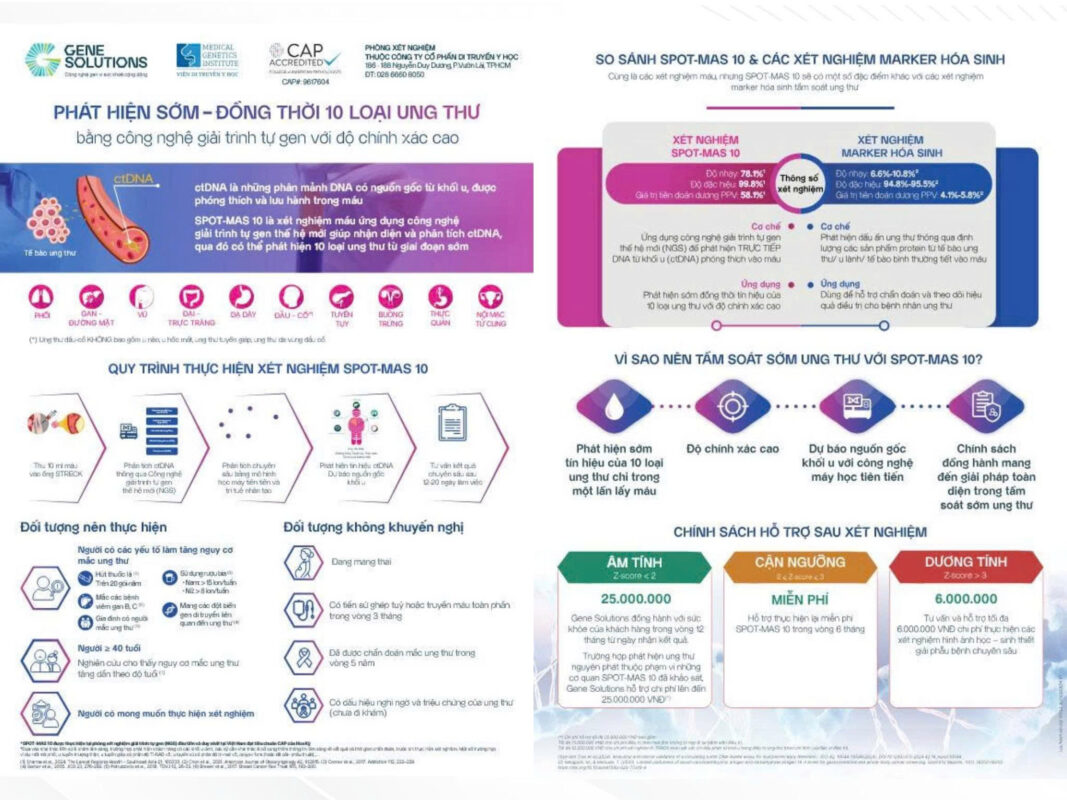 SPOT-MAS 10 mang độ chính xác cao thông qua ứng dụng công nghệ giải trình tự gen thế hệ mới, dự báo nguồn gốc khối u với công nghệ máy học tiên tiến và đặc biệt hơn là chính sách đồng hành mang đến giải pháp toàn diện trong tầm soát ung thư sớm. Để được tư vấn cụ thể về xét nghiệm SPOT-MAS 10, quý khách vui lòng liên hệ số điện thoại bên dưới hoặc trực tiếp vào tin nhắn FB Bệnh viện Đa khoa Hoàng Tuấn.
