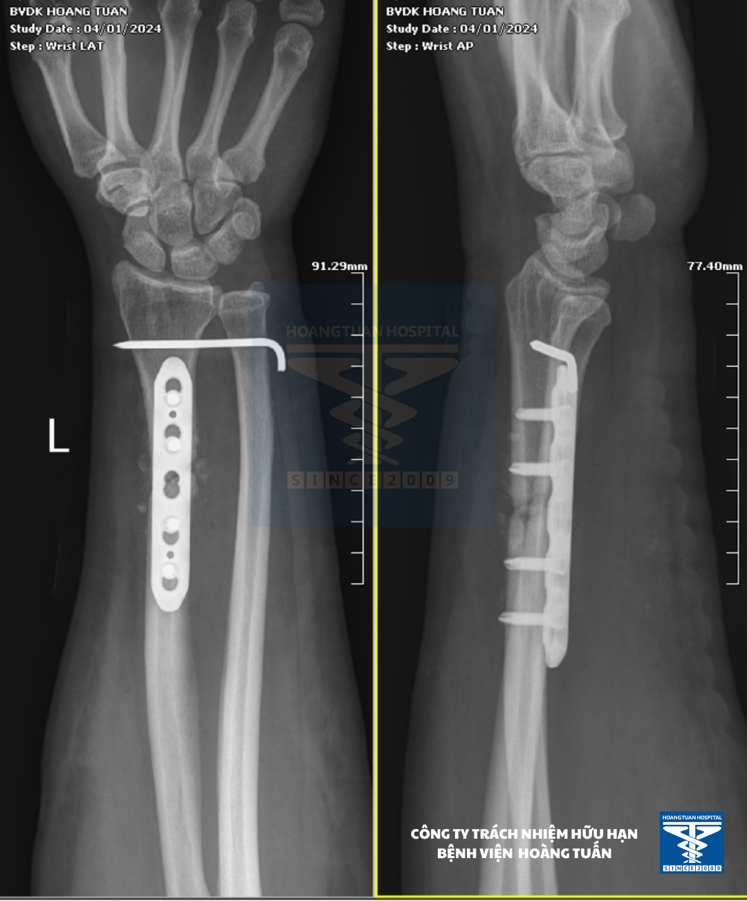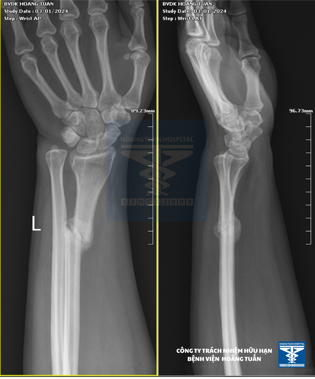 Vừa qua, vào Tháng 1 năm 2024 Bệnh viện Đa khoa Hoàng Tuấn tiếp nhận một bệnh nhân nữ 41 tuổi tự té chống vùng tay trái trực tiếp xuống đất, gãy xương vùng cẳng tay trái điều trị bó bột và đắp thuốc bắc trong 5 tuần không bớt. Đến với Bệnh viện đa khoa Hoàng Tuấn bệnh nhân được chỉ định chụp X-quang cẳng bàn tay trái, kết quả ghi nhận gãy 1/3 dưới xương quay bên trái kèm trật khớp quay trụ dưới (kiểu gãy Galeazzi). Đây là trường hợp gãy cũ “Galeazzi” và được các bác sĩ Chuyên khoa Chấn thương hội chẩn chỉ định phẫu thuật nắn trật cố định kèm kết hợp xương quay bên trái.