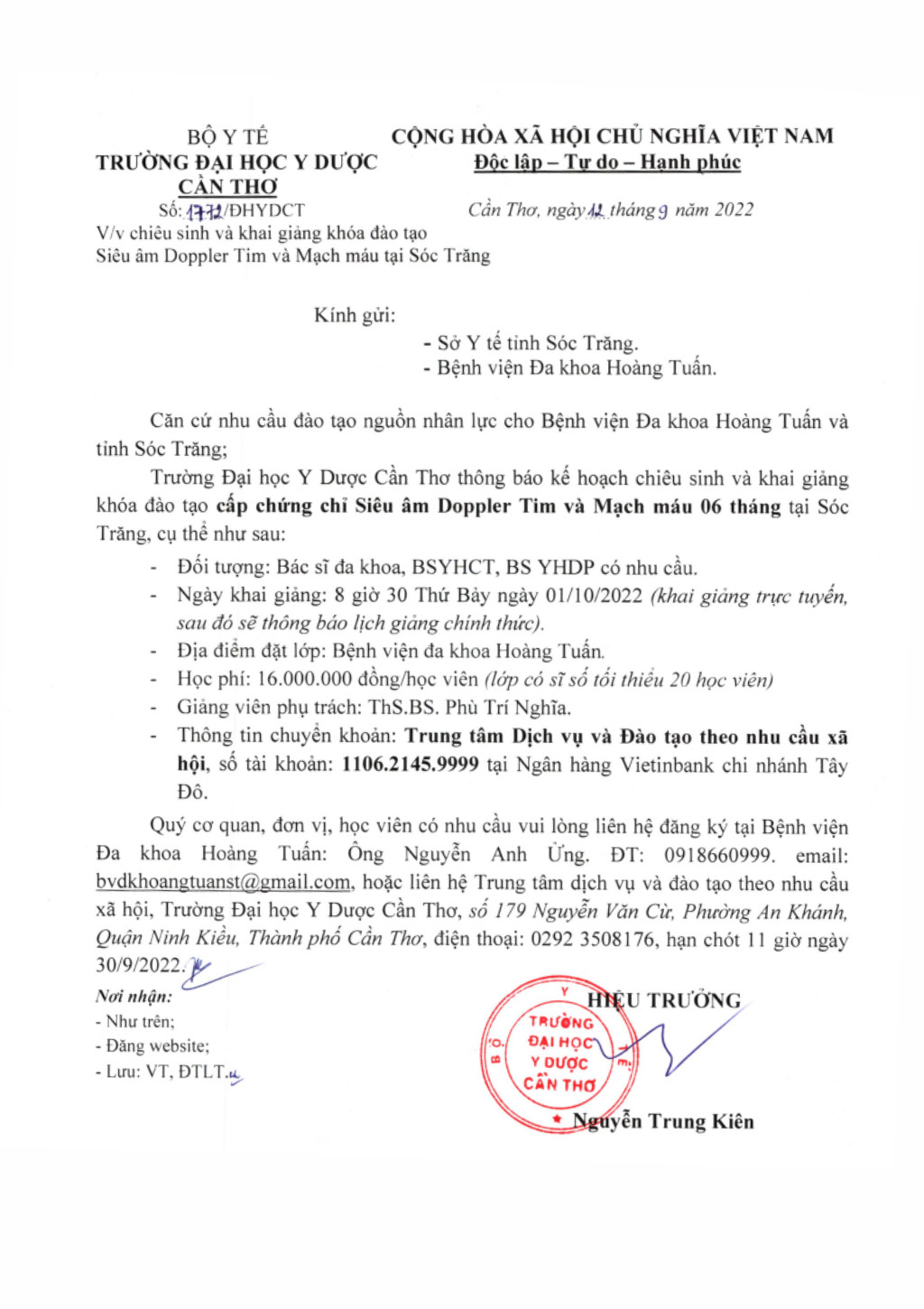☀️Căn cứ nhu cầu đào tạo nguồn nhân lực cho Bệnh viện Đa khoa Hoàng Tuấn và tỉnh Sóc Trăng; 🏢Trường Đại học y Dược Cần Thơ thông báo kế hoạch chiêu sinh khai giảng khóa đào tạo Cấp chứng chỉ Siêu âm Doppler Tim và Mạch máu 06 tháng tại Sóc Trăng