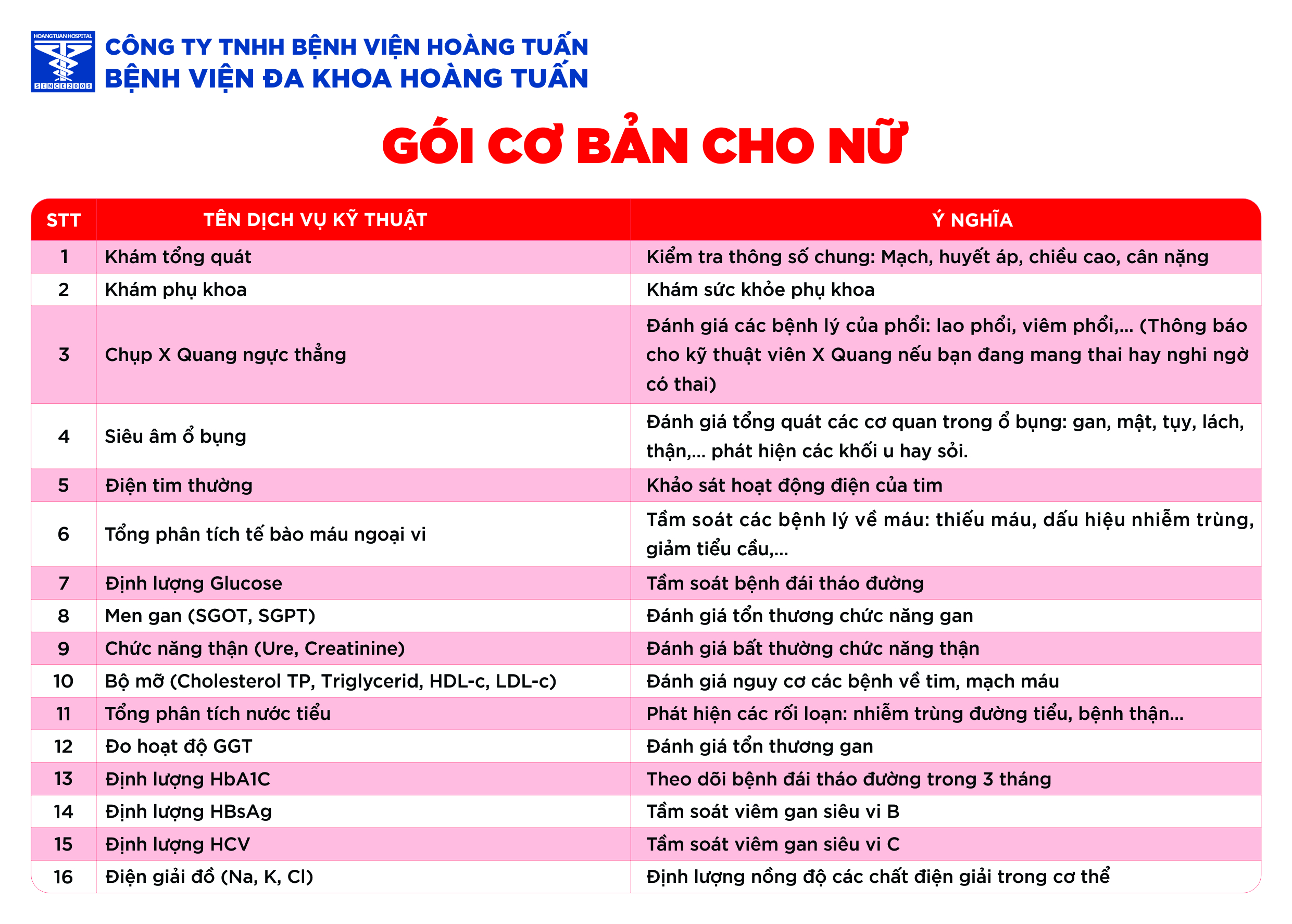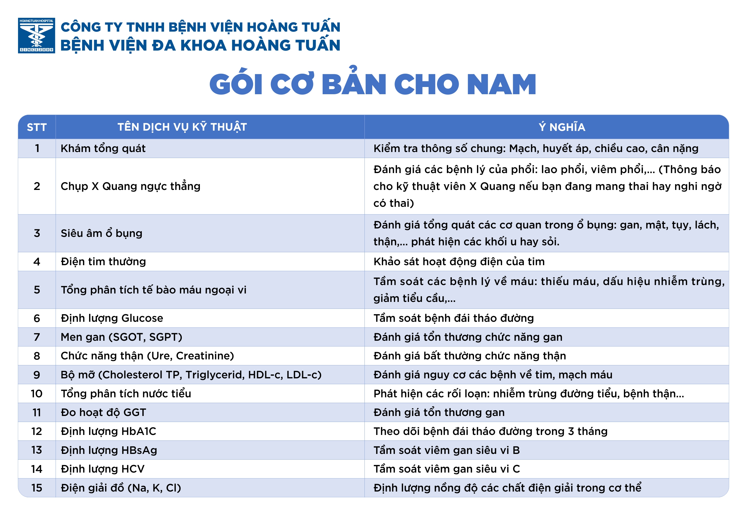 Bệnh viện Đa khoa Hoàng Tuấn triển khai dịch vụ khám sức khỏe tổng quát – GÓI CƠ BẢN, bao gồm các xét nghiệm máu và nước tiểu để đánh giá sự hoạt động cơ bản của cơ thể, kết hợp với các phương pháp chẩn đoán hình ảnh và thăm dò chức năng giúp cung cấp một cái nhìn cơ bản về tình trạng sức khỏe.