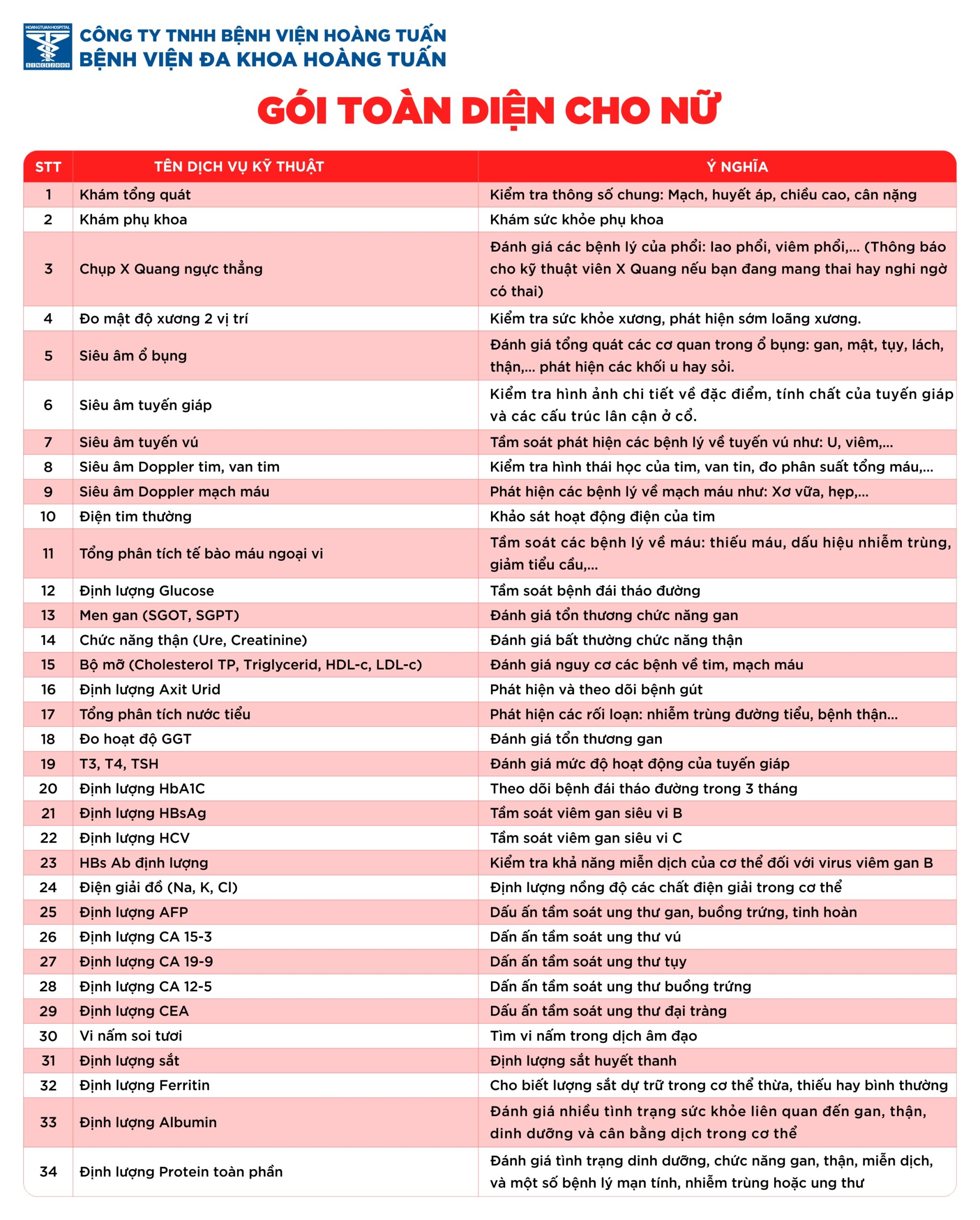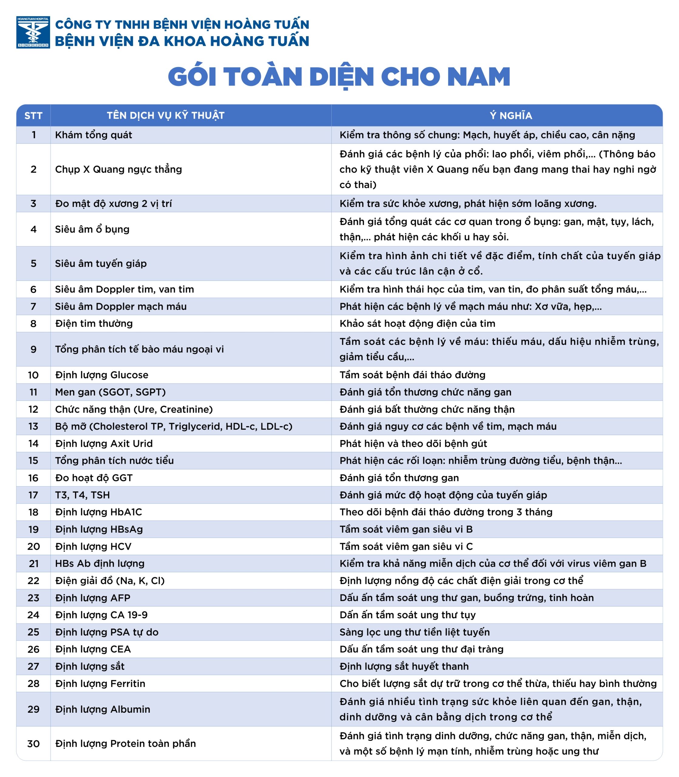 Bệnh viện Đa khoa Hoàng Tuấn triển khai dịch vụ khám sức khỏe tổng quát – GÓI TOÀN DIỆN, ngoài các xét nghiệm cơ bản, gói này còn đưa vào các xét nghiệm chuyên sâu và các xét nghiệm định lượng các dấu ấn ung thư để tầm soát một số bệnh lý ung thư thường gặp. Ngoài ra, gói này còn cung cấp các phương pháp chẩn đoán hình ảnh và thăm dò chức năng giúp phát hiện sớm và đánh giá rõ ràng về các biến đổi sức khỏe tiềm ẩn.