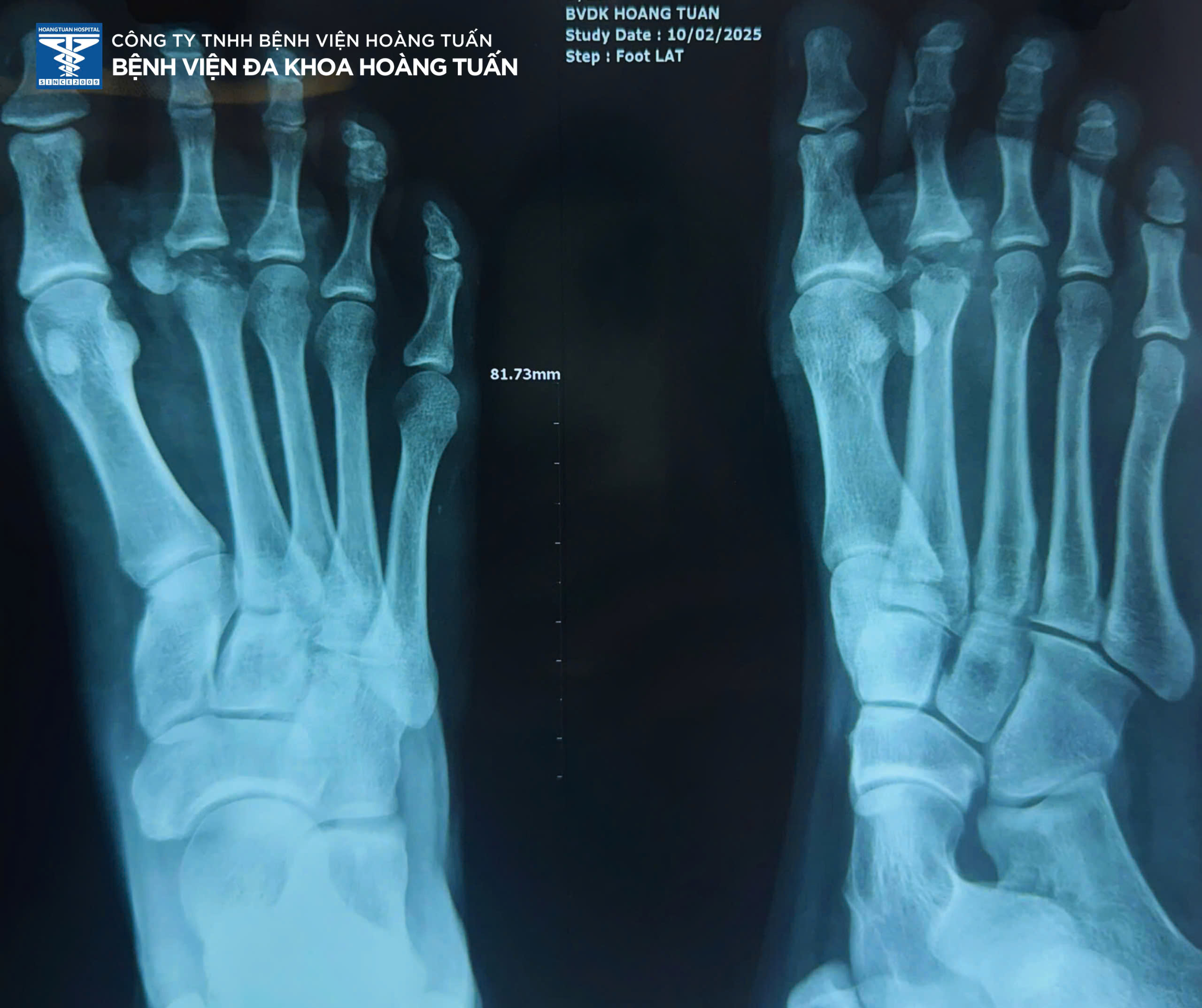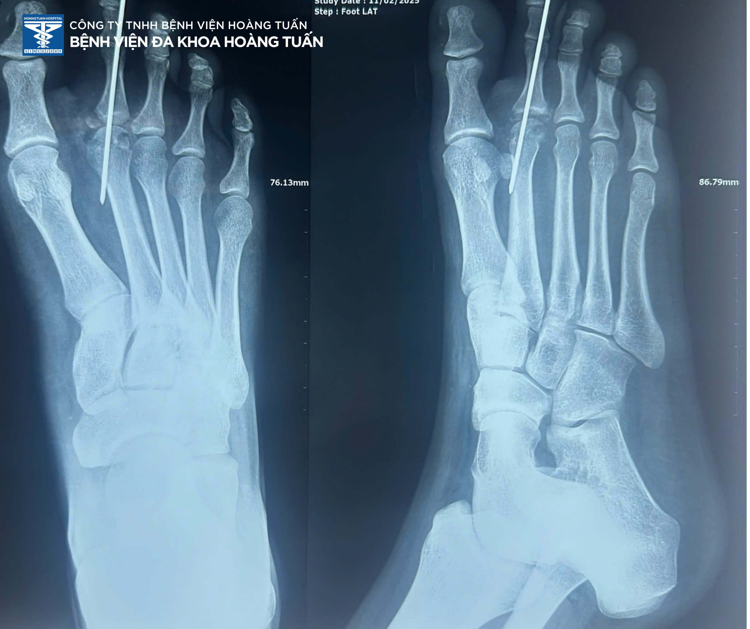 Vừa qua, Bệnh viện Đa khoa Hoàng Tuấn vừa tiếp nhận một trường hợp bệnh nhân nữ trẻ tuổi vào viện vì đau, chảy máu nhiều vết thương vùng bàn ngón chân phải sau tai nạn giao thông. Qua thăm khám và chụp X-quang vùng bàn ngón chân phải kiểm tra, phát hiện gãy vùng xương bàn ngón II bên phải. Ban lãnh đạo Bệnh viện và Bác sĩ Ngoại Chấn thương hội chẩn và thống nhất quyết định phẫu thuật điều trị phục hồi vùng xương gãy.