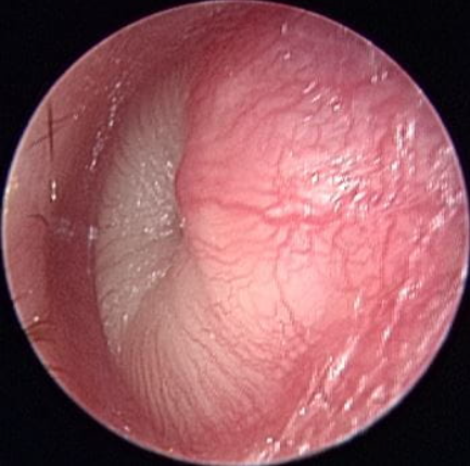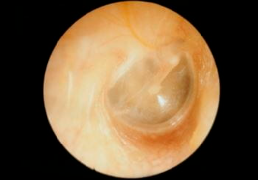 Khám soi tai: (phóng đại) điển hình là màng nhĩ phồng lên, có thể thấy mủ chảy ra từ màng nhĩ và nhìn thấy sự xuất hiện của mủ phía sau màng nhĩ.